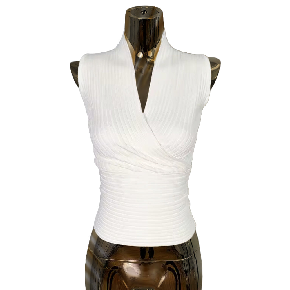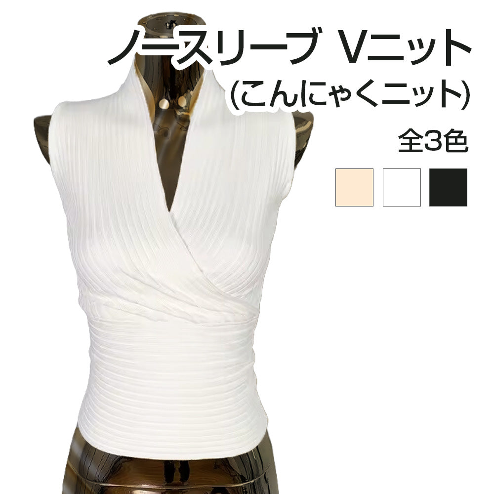 エステサロンのセラピストに最適な体にしっかりフィットするノースリーブVニットです。